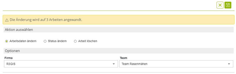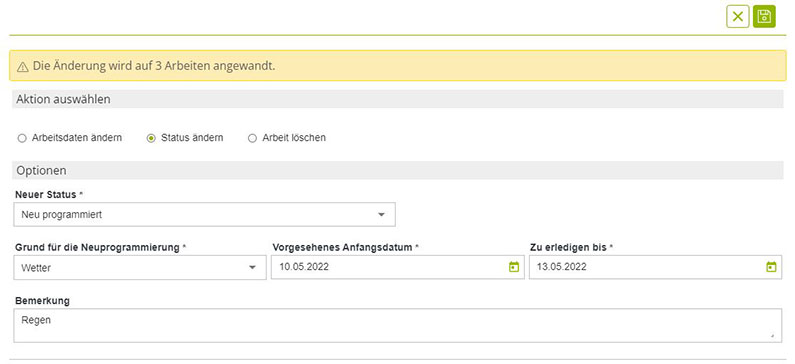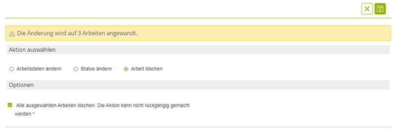 Achtung: Alle oben genannten Maßnahmen sind nicht mehr rückgängig zu machen! Es können maximal 100 Aufträge auf einmal bearbeitet werden. Diese Funktion ist nur für Benutzer der Gruppen ADMIN und OPERATOR_PLUS verfügbar. Die Mehrfachschließung von Arbeiten ist daher für die Benutzer OPERATOR/OPERATOR_TREE und OPERATOR_PLAY nicht mehr möglich.