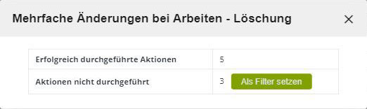 Zur Bestätigung der Aktion wird vom System eine Meldung angezeigt, in der bestätigt wird, dass die Änderung durchgeführt worden ist. - Arbeiten löschen: In diesem Fall werden die ausgewählten Aufträge vollständig aus dem System gelöscht. Damit dies möglich ist, dürfen Fotos und Dokumente nicht mit einer Arbeitskarte verknüpft sein. Ebenso dürfen die zur Löschung ausgewählten Arbeiten nicht Teil eines bestimmten Workflows sein oder aus einem solchen stammen (siehe Kasten oben).