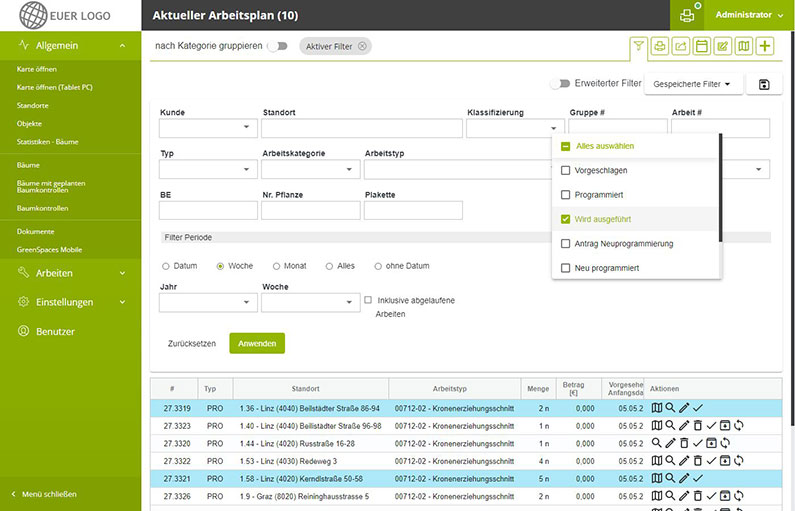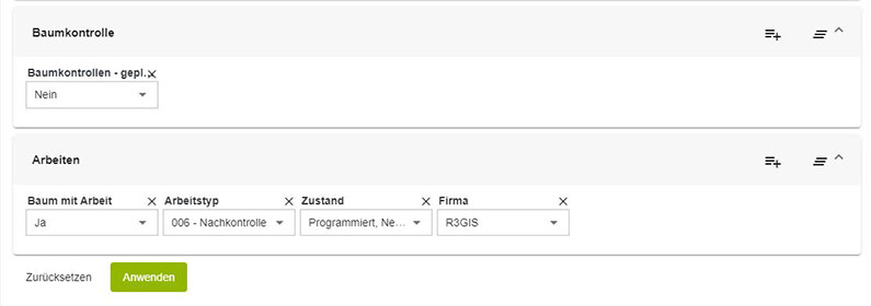 In GreenSpaces werden bei der Validierung einer BKT für jeden Baum automatisch Arbeiten des Typs "Nachkontrolle" geplant. Die Stadtverwaltung vergibt diese Art von Arbeiten an externe Auftragnehmer. Dieser Prozess wurde durch die bereits beschriebene Funktion "Mehrfachbearbeitung" von Arbeiten vereinfacht. Im erweiterten Filter der "Bäume" im Abschnitt "Arbeiten" wurde das Feld "Firma" für die Suche verfügbar gemacht. So kann das externe Unternehmen Bäume ohne geplante BKT herausfiltern, die Gegenstand von "Nachkontrollen" mit dem Status "programmiert" oder "neu programmiert" sind und der eigenen Firma zugewiesen wurden. Es ist möglich, zusätzliche Filter anzuwenden, wie z. B. die geplanten Termine für die "Nachkontrolle" oder ein Gebiet auf der Karte auszuwählen.
