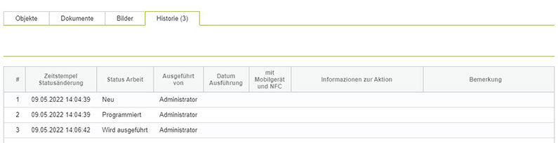 Auf der Seite der Webanwendung wird die Arbeit, sobald sie synchronisiert und vom Mitarbeiter im Feld "Wird Ausgeführt" gesetzt wurde, blau markiert und kann nicht mehr gelöscht, neu programmiert oder archiviert werden. Die Informationen sind immer direkt im Arbeitsformular auf der Registerkarte "Historie" verfügbar (siehe Abbildung unten).
