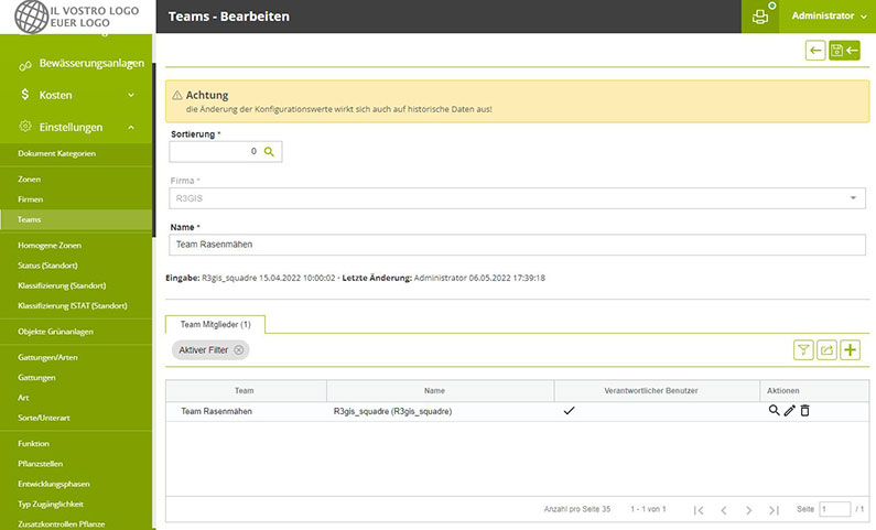 Im Modul WORKS wurde die Möglichkeit eingeführt, Teams innerhalb von Firmen zu verwalten. Teams können im Menü "Konfiguration/Teams" oder in der Registerkarte "Teams" innerhalb einer Firma konfiguriert werden. Jedes Team muss einer Firma angehören. Für jedes Team ist es möglich, die Mitglieder aus der Liste der bereits zum Unternehmen gehörenden Benutzer auszuwählen und, falls erforderlich, die verantwortliche Person zu bestimmen.