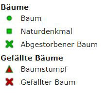 Auf vielfachen Wunsch unserer Anwender haben wir die grafische Darstellung der Bäume auf der Karte aktualisiert. Das Symbol für den toten Baum wurde von einem "grünen Kreuz" in ein "grünes X" geändert. Die gleiche Symbologie wurde auch in GreenSpaces Mobile verwendet. Nachfolgend finden Sie die neue Baumstatus-Legende.