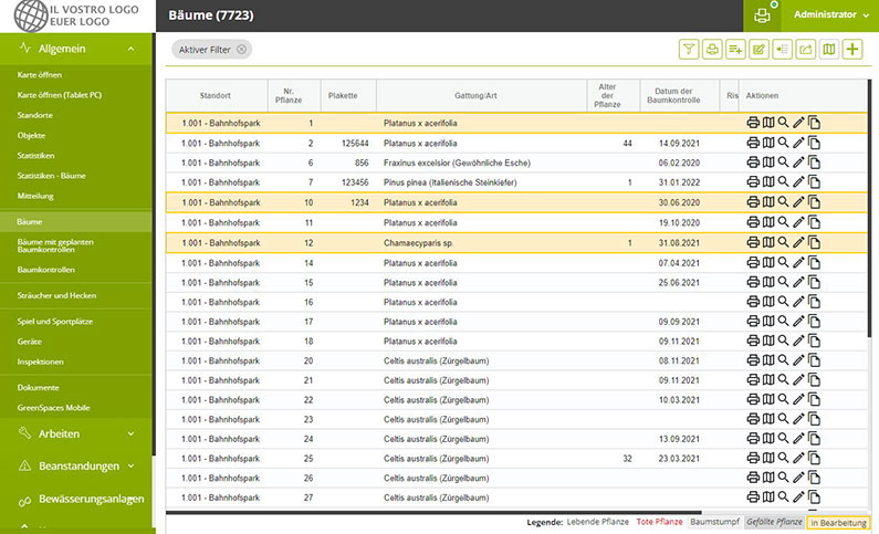 Der Stil der Bäume die "In Bearbeitung" sind wurde geändert, um sie in der Menüliste "Bäume" auf einen Blick sichtbar zu machen. In der neuen Version werden diese Einträge in der neuen Legende gelb hervorgehoben (siehe Abbildung unten).