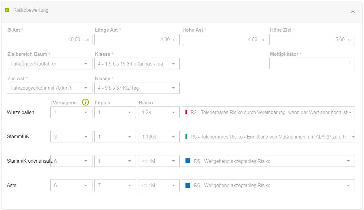 Der zweite Abschnitt ermöglicht die Bewertung des Risikos und der Versagenswahrscheinlichkeit verschiedener Baumelemente, wobei eine Risikoklasse in Echtzeit auf der Grundlage der vom Arete-Protokoll gelieferten Werte berechnet wird.
