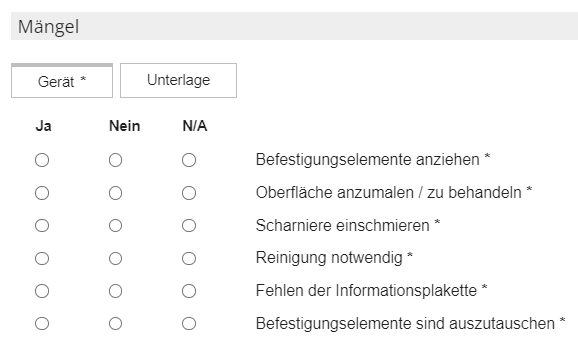 Das Inspektionsformular für Spiel- und Sportgeräte wurde überarbeitet, um es an die aktuellen Vorschriften anzupassen. Es können nun verschiedene Arten von Inspektionen konfiguriert werden und für jede Art von Inspektion kann eine andere Liste von Kontrollen ausgewählt werden.