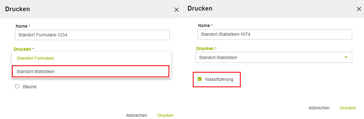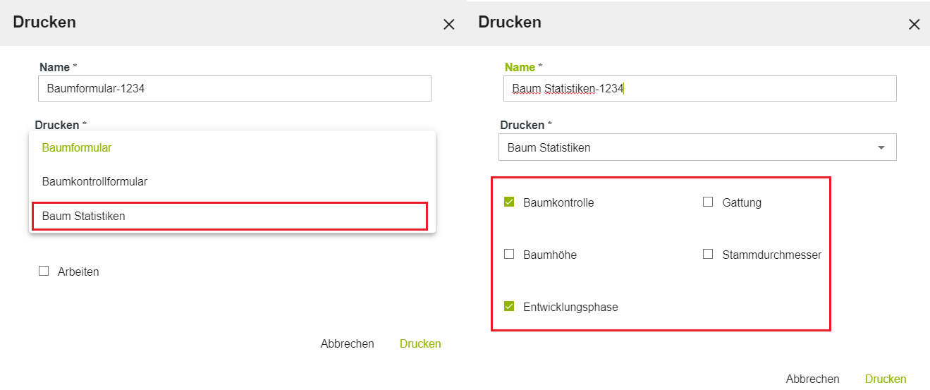 , in der oberen rechten Ecke die Druckart "Baum-Statistiken" aus dem Dropdown-Menü auszuwählen (siehe Abbildungen unten). Man erhält so einen Ausdruck für einen, mehrere oder alle der folgenden Parameter: "BKT", "Gattung", "Höhe", "Stammdurchmesser" oder "Entwicklungsphase".