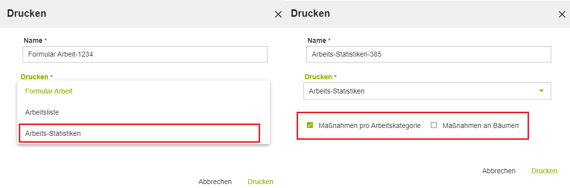 , in der oberen rechten Ecke die neue Druckart " Arbeits-Statistiken" aus dem Dropdown-Menü auszuwählen. Durch die Auswahl dieser Druckart kann ein Ausdruck für den Parameter " Maßnahmen pro Arbeitskategorie", "Maßnahmen an Bäumen" oder für beide erstellt werden.