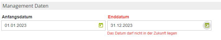 Bisher war es möglich, im Feld "Enddatum" eines Standortes oder eines Spielplatzes einen Zeitpunkt in der Zukunft anzugeben, wodurch das Objekt aber sofort historisiert wurde und es zu Anomalien in der Datenbank kam. Um Inkonsistenzen in der Datenbank zu vermeiden, wurde dieses Problem mit dieser Aktualisierung gelöst, indem der Benutzer während der Eingabe verhindert und gewarnt wird (siehe Abbildung unten), ein "Enddatum" in der Zukunft zu setzen.