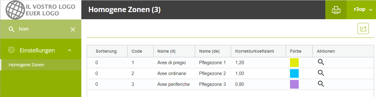 Die 'Homogene Zone' ist ein Attribut des Formulars 'Standorte', das auf Wunsch des Kunden aktiviert werden kann und das die Verwaltungsstufe verschiedener Standorte identifiziert, wie z.B. intensiv gepflegte Grünflächen oder extensive Zonen.