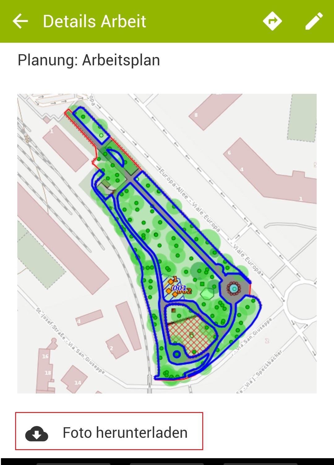 Während der Synchronisierung werden diese Fotos in die zentrale Datenbank (GreenSpaces Web) hochgeladen und sind in der mobilen App nicht mehr sichtbar. Es ist jedoch möglich, das als Hauptbild markierte Foto über die entsprechende Schaltfläche auf dem Arbeitsformular abzurufen. |