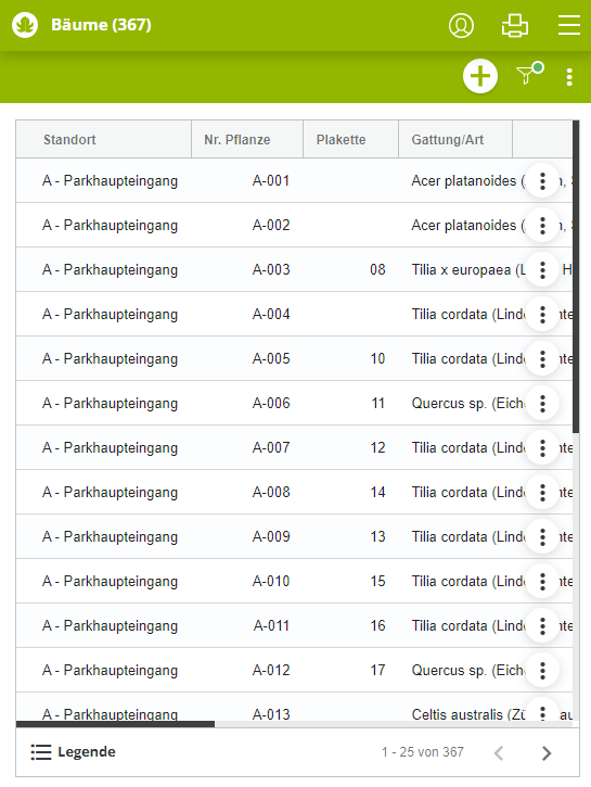 Die Benutzeroberfläche der Webanwendung wurde überarbeitet, um die Nutzung von GreenSpaces auch auf Tablets und Smartphones zu erleichtern. Insbesondere wurde die Anzeige der Listen optimiert: der obere Teil des Fensters, der die Gesamtzahl der Objekte in diesem Menü enthält, die Aktionsschaltflächen, die Anzeige von Filtern, die Gruppierung von Schaltflächen, die es ermöglichen, auf die Daten am Ende jeder Zeile einzuwirken, und die Optimierung des unteren Teils des Bildschirms durch die Schaffung eines Popup-Fensters für die Legende. All diese Verbesserungen der Benutzeroberfläche sind vor allem auf kleinen Bildschirmen sichtbar.