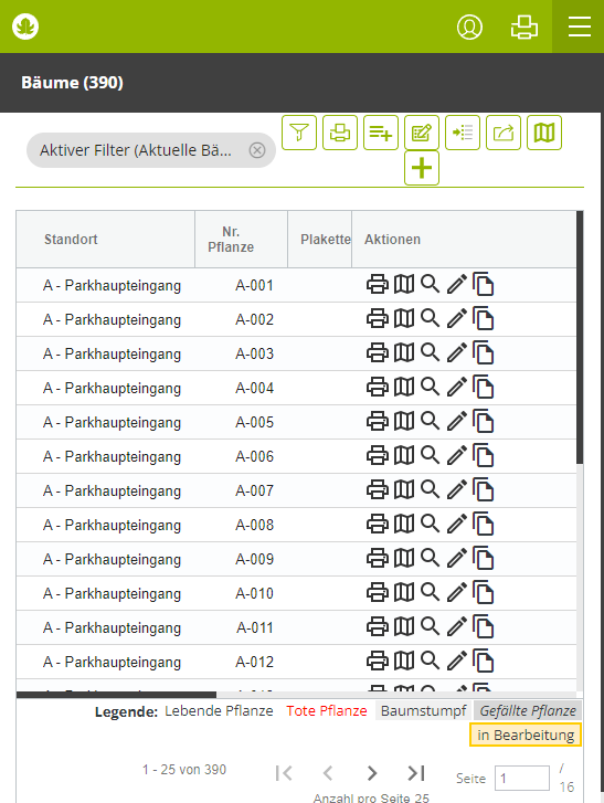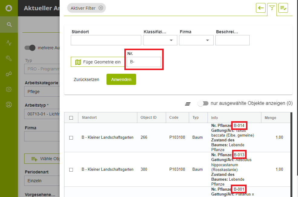 Angleichung der erweiterten Filter zwischen der Liste "Bäume" und der Liste "Aktueller Arbeitsplan";