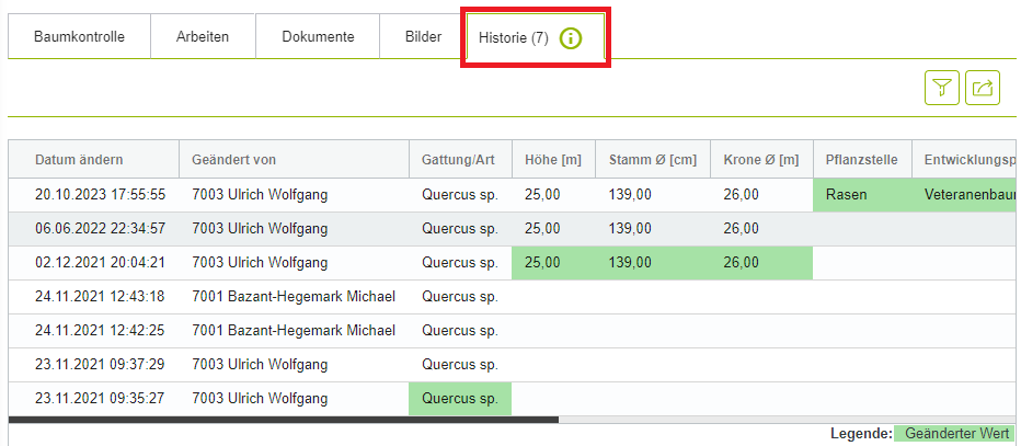 Auf dem Baumformular wurde der Reiter "Historie" vervollständigt, um Änderungen bestimmter Pflanzenparameter (Taxonomie, Höhe, Stammdurchmesser, Kronendurchmesser, Entwicklungsphase, Position) anzuzeigen. Jedes Mal, wenn einer dieser Parameter geändert wird, wird der Historientabelle eine Zeile hinzugefügt, die anzeigt, welcher Wert geändert wurde, wer ihn geändert hat und wann. In dieser Sektion werden alle Änderungen, die im Laufe der Zeit am Baumformular vorgenommen wurden, angezeigt (die GreenSpaces zuvor erfasst, aber nicht angezeigt hat), und von dieser Aktualisierung an wird jede einzelne Änderung in der Liste angezeigt, einschließlich derjenigen, die sich auf die Änderungen des Status der Pflanze beziehen und schon in der vorherigen Version des Reiters vorhanden waren. Alle Daten können gefiltert und exportiert werden.