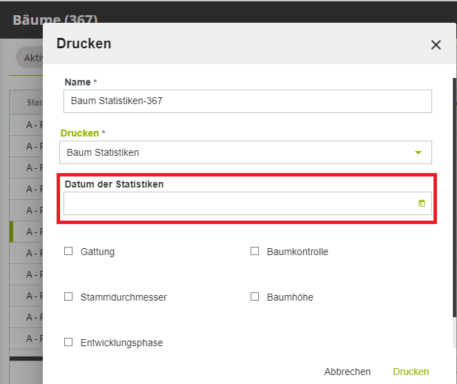 Beim Ausdruck der Baumstatistik bietet das Dialogfeld nun die Möglichkeit, das Datum einzugeben, auf das sich die Statistik beziehen soll (siehe Abb. 4.1)