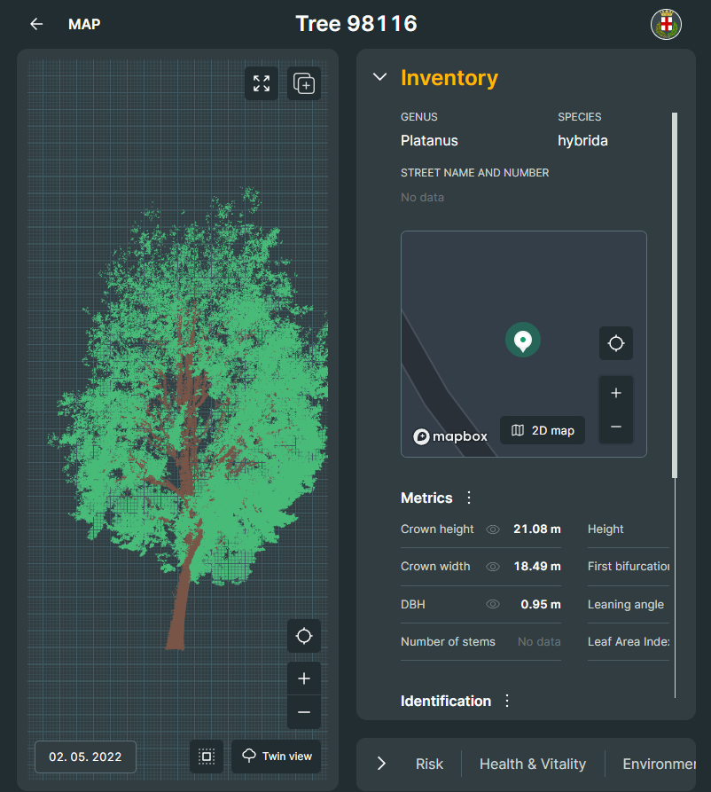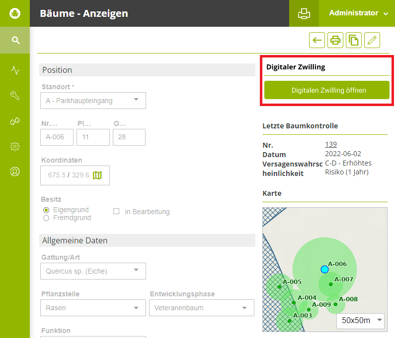 Für unsere Kunden, die mit greehill (www.r3gis.com/greehill) ein Abonnement für die Erhebung der digitalen Zwillinge zur intelligenten Baumerfassung abgeschlossen haben, ist es nun möglich, vom Baumformular in GreenSpaces per Knopfdruck zur digitalen Darstellung des Baumzwillings auf der greehill-Plattform zu wechseln.