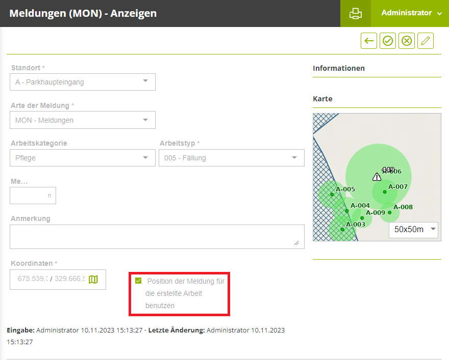 Eine Meldung (MON) kann mit einem Objekt verbunden werden und die daraus resultierende Arbeit erbt dessen Position. Bei punktförmigen Objekten ist es die Punktposition, bei Flächen ist es der Schwerpunkt der Fläche und bei linearen Objekten ist es der Punkt in der Mitte der Linie.