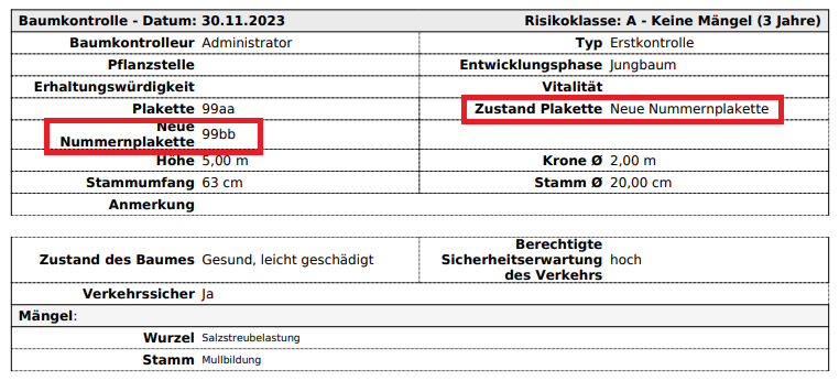 Wird bei einer Baumkontrolle ein Plakettenwechsel festgestellt, so wird auf dem Ausdruck der Baumkontrolle sowohl die alte als auch die neue Plakettennummer angegeben.