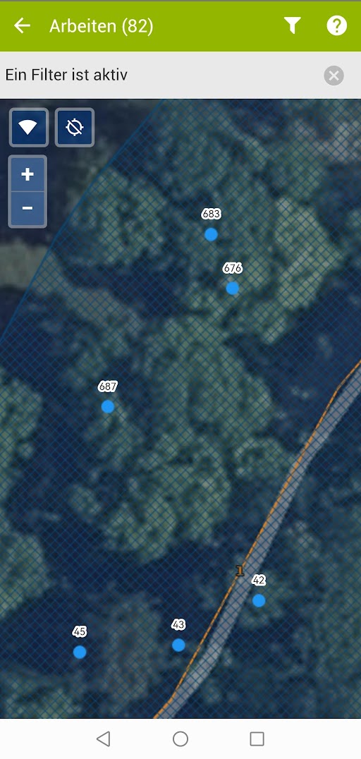 Verhalten der mobilen App in Bezug auf Filter, wenn mehr als 500 Arbeiten in der mobilen Karte angezeigt werden sollen.