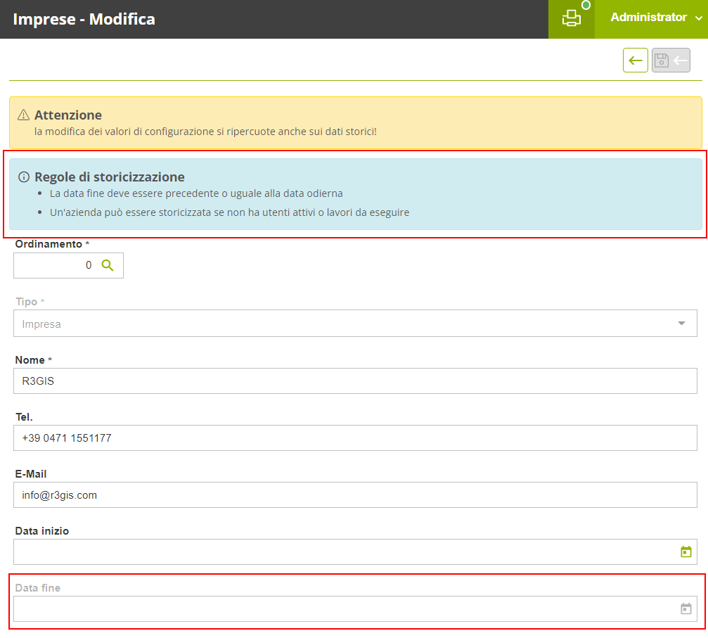 È possibile storicizzare un'impresa, quindi compilare la “Data fine”, solo se il sistema non riscontra più utenti attivi appartenenti ad essa e/o lavori ancora da eseguire ad essa assegnati (Vedi immagine sottostante - Regole di storicizzazione).