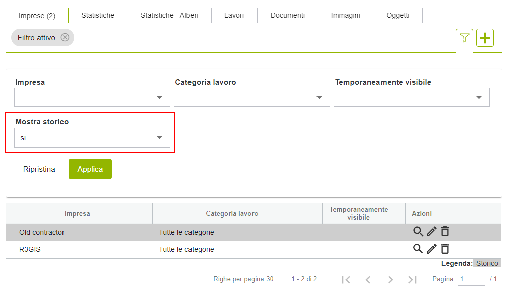 La “Data fine” inserita, deve essere precedente o uguale alla data in cui viene fatta la storicizzazione. Non è quindi possibile inserire una “Data fine” futura. Inoltre, il menù di configurazioni “Imprese” è stato integrato con i nuovi filtri che permettono di ricercare le imprese storicizzate (“Mostra storico”). Esse appariranno negli elenchi con la dicitura in corsivo su sfondo grigio. Nella scheda “Località”, visionando il tab “Imprese”, saranno visibili di default solo le imprese attive e/o con visibilità temporanea su tale località. Per consultare anche le imprese che vi hanno lavorato in passato, basterà attivare il filtro di ricerca “Mostra storico” (vedi immagine sottostante).