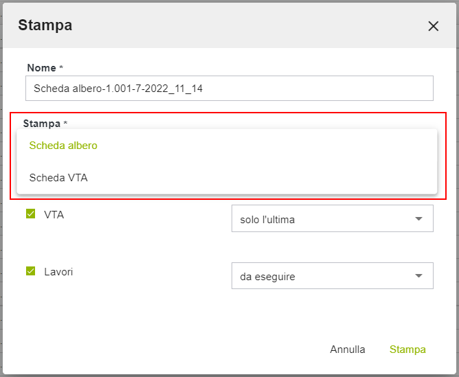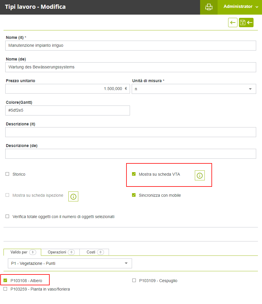 Concretamente, se un tipo di lavoro deve essere visibile nella scheda “VTA” in modo che possa essere proposto nel momento della compilazione della scheda, sia dal Web che dal Mobile, questo tipo lavoro deve essere innanzitutto abbinato al tipo oggetto “P103108- Albero” ed inoltre deve essere contrassegnato come “Mostra su scheda VTA”.