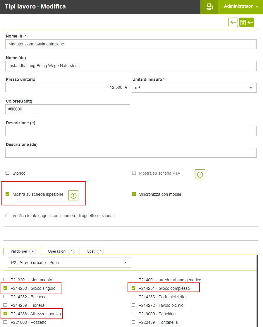 Allo stesso modo, se un tipo di lavoro deve essere visibile nella scheda “Ispezione” in modo che possa essere proposto nel momento della compilazione della scheda, questo tipo di lavoro deve essere innanzitutto abbinato al tipo oggetto “P214250 - Gioco singolo”, “P214251 - Gioco complesso” e/o “P214288 - Attrezzo sportivo” ed inoltre deve essere contrassegnato come “Mostra su scheda Ispezione”.