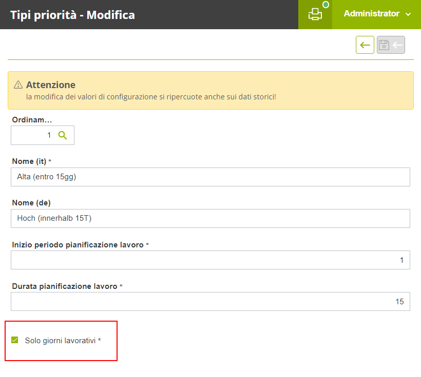 Nella configurazione della “Priorità” dei lavori ora è possibile decidere se i giorni di riposo e festivi vengono considerati o meno nel calcolo delle date impostate per un lavoro. Di default vengono contati i giorni solari per calcolare “Data inizio” e “Data fine” del lavoro previsto. Con la nuova funzionalità è possibile modificare questo comportamento in modo che vengano contati solo i giorni lavorativi, escludendo i giorni di riposo e festivi, tra “Data inizio" e “Data fine” del lavoro.