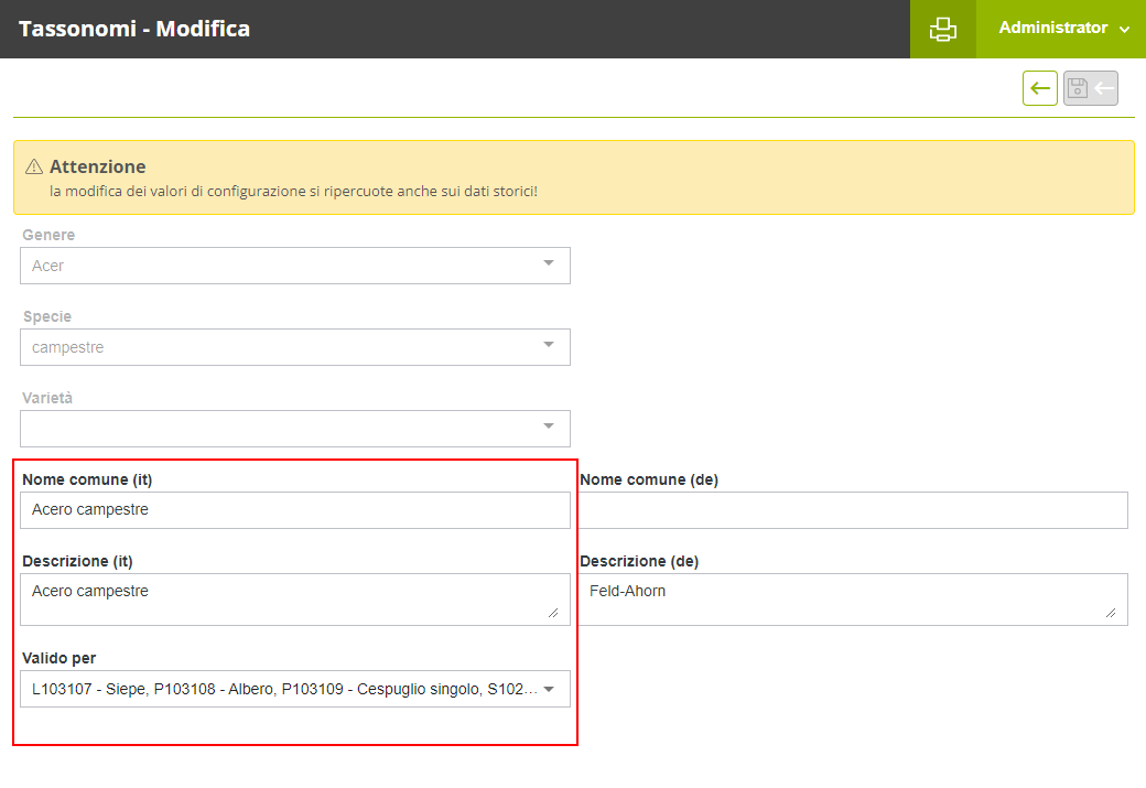 Per alcuni clienti la piattaforma GreenSpaces contiene un elenco standardizzato di tassonomie. Questo elenco è composto solo da nomi scientifici controllati ed esistenti e viene utilizzato per il calcolo dei servizi ecosistemici nel Modulo BENEFITS e per il calcolo del fabbisogno idrico nel Modulo WATER. Fino ad oggi la modifica di queste tassonomie era completamente inibita.