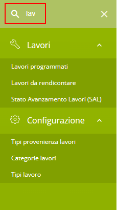 È stata implementata una barra di ricerca che facilita l’accesso alle funzionalità dell’applicativo. La barra, posta a sinistra sopra i menu principali, permette di ricercare tutto l’albero dei menù digitando anche solo parte della voce ricercata. In questo modo è più veloce trovare le voci, soprattutto nelle sezioni più lunghe del menù, per esempio nelle “Configurazioni”.