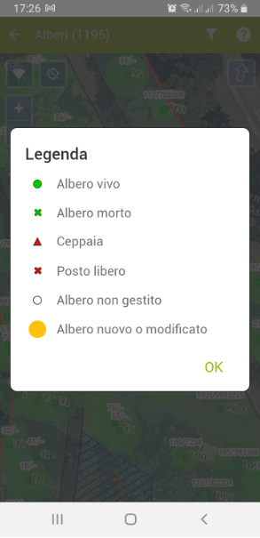 In fase di censimento o di modifica in campo della scheda di un albero con l’App Mobile, dopo aver effettuato il salvataggio sarà immediatamente possibile visualizzare in mappa la pianta nuova o modificata, che assumerà un’evidenziazione grafica in colore arancione fino alla sincronizzazione seguente (vedi immagine sottostante).