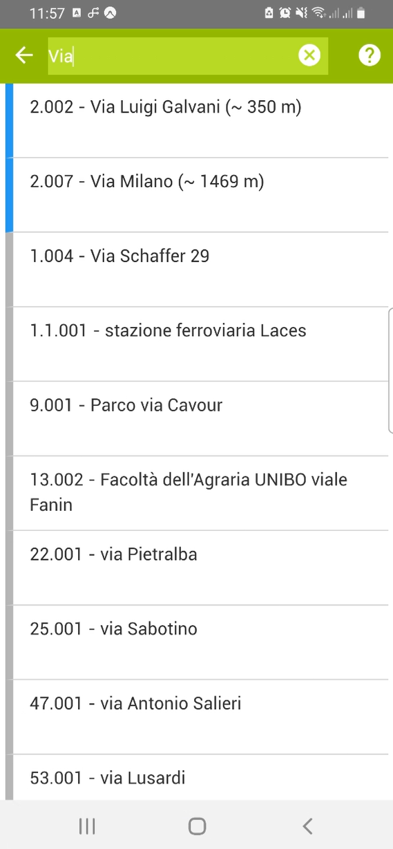 Ordine per vicinanza: se per l’inserimento del nuovo oggetto viene rilevata la posizione attuale del dispositivo, la località viene assegnata in automatico in base alla posizione rilevata. È comunque possibile modificare manualmente la località tramite l’elenco. Le 10 località più vicine sono posizionate in alto nell’elenco in ordine di distanza dalla posizione attuale. Per queste 10 località è indicata la distanza della posizione attuale dal vertice più vicino del poligono, che definisce il confine stesso della località. Seguono le altre località in ordine alfabetico.
