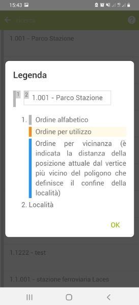 Ordine per utilizzo: nel caso in cui alcuni oggetti sono già stati inseriti da GS Mobile nell’ultima sessione, le ultime 5 località utilizzate vengono mostrate in alto nell’elenco, seguite dalle altre località in ordine alfabetico;