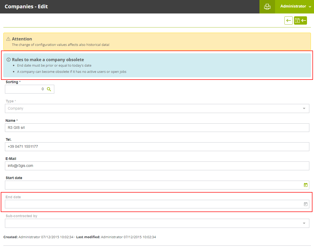 Until now, in GreenSpaces, it was possible in the "Companies'' configuration to fill in the "End date" field as simple information, to indicate, for example, the end date of the contract. However, entering the "End date" had no effect on the company-related functionality in GreenSpaces. From this version onwards, the archiving of companies also becomes functional. It is now possible to archive a company that no longer operates on the platform, by following the rules below: