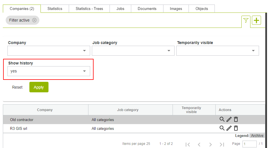 The "End date" entered, must be prior to or equal to the date on which the archiving is done. It is therefore not possible to enter a future "End date". In addition, the "Companies" configuration menu has been supplemented with new filters that allow you to search for historicised companies ("Show history"). They will appear in the lists with the wording in italics on a grey background. In the "Site" form, only active companies and/or companies with temporary visibility on that site will be visible by default. To also view companies that have worked there in the past, simply activate the search filter "Show history" (see image below).