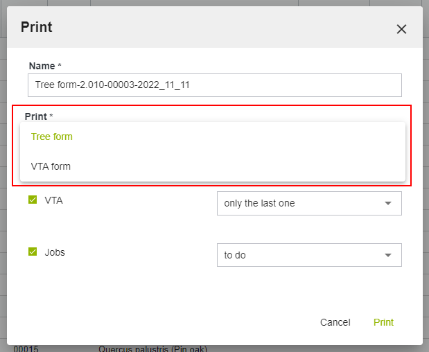 With this release, the behavior between Web and Mobile has been standardised with regard to the jobs visible in the "VTA" and "Inspection" forms. Only jobs that are valid for green codes subject of the form are visible in the "VTA" forms for trees or "Inspection" forms for equipment.
