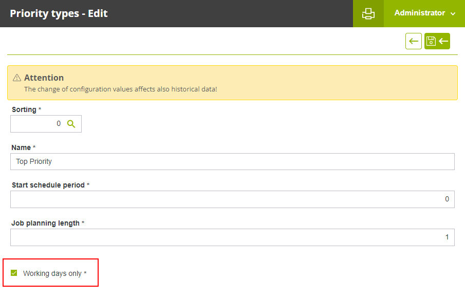 In the configuration of the "Priority" of jobs, it is possible to decide whether or not rest days and public holidays are taken into account when calculating the dates set for a job. By default, calendar days are counted when calculating the "Start date" and "End date" of the job. With the new functionality it is possible to change this behaviour so that only working days, excluding rest days and holidays, are counted between the "Start date" and "End date" of the job.