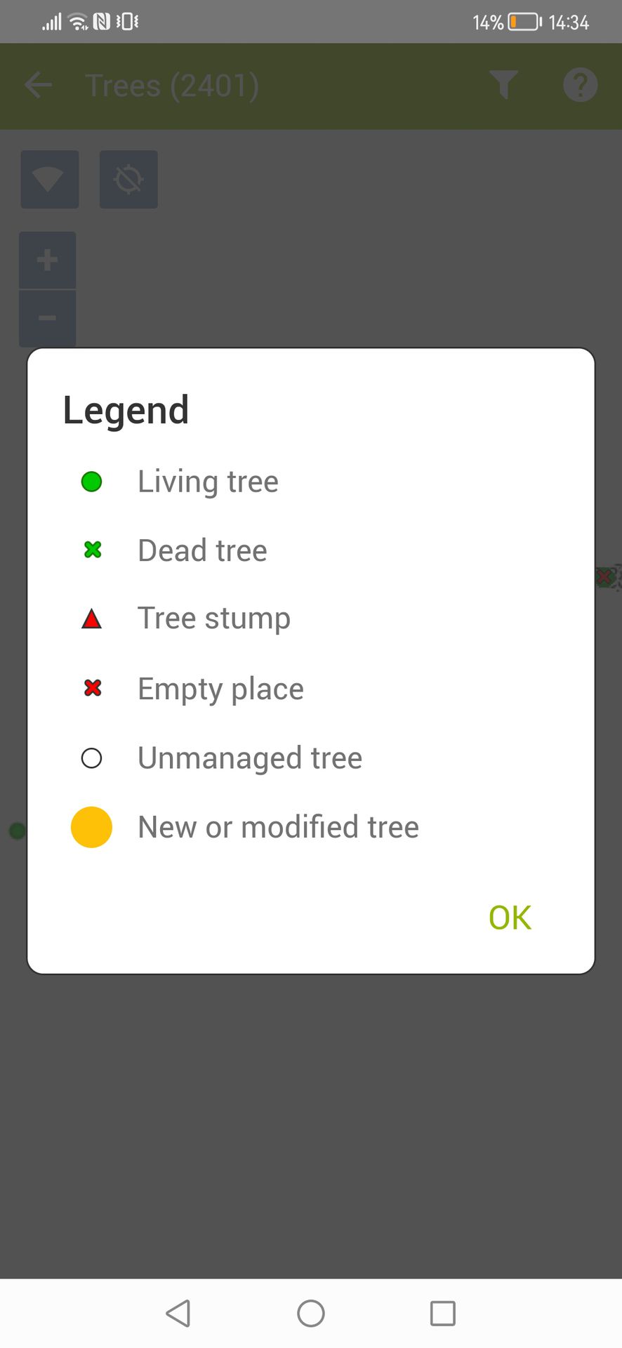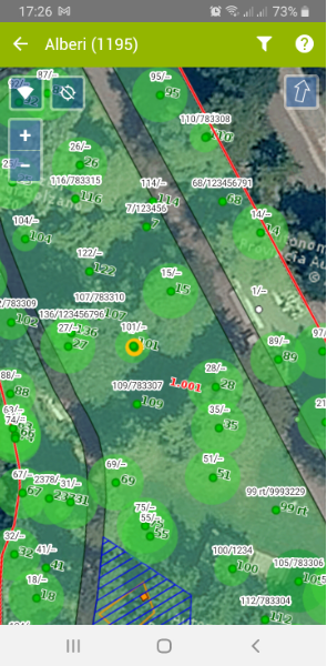 When conducting the census or editing a tree record in the field with the Mobile App, after saving it, it will immediately be possible to identify the new or modified tree in the map, which will be graphically highlighted in orange until the following synchronisation (see image below).