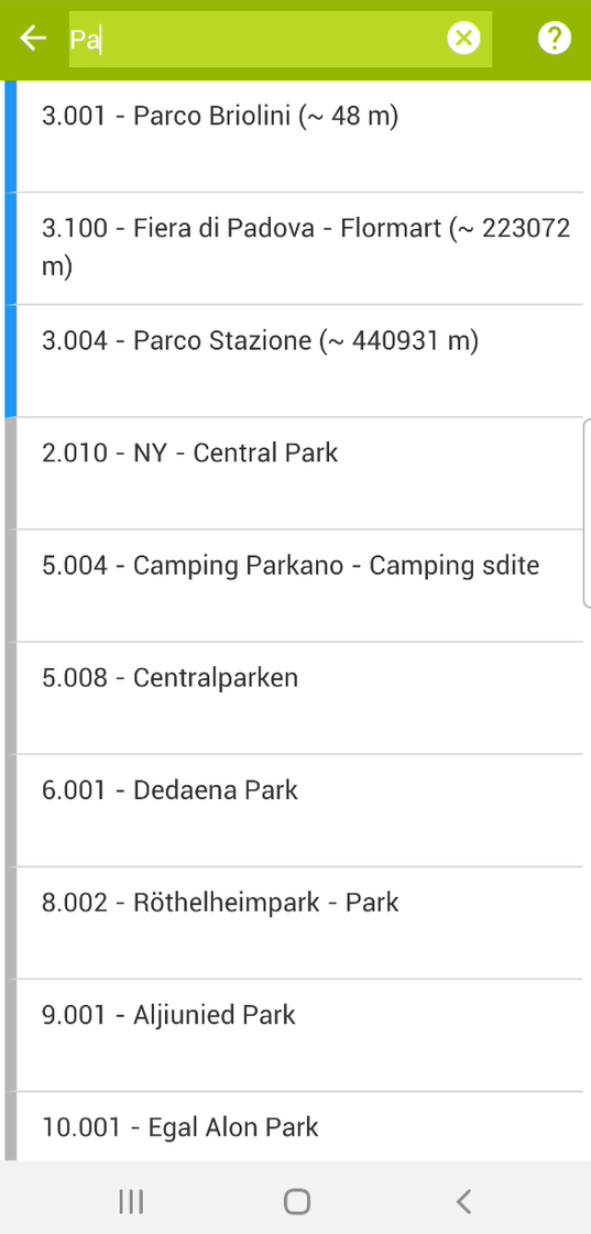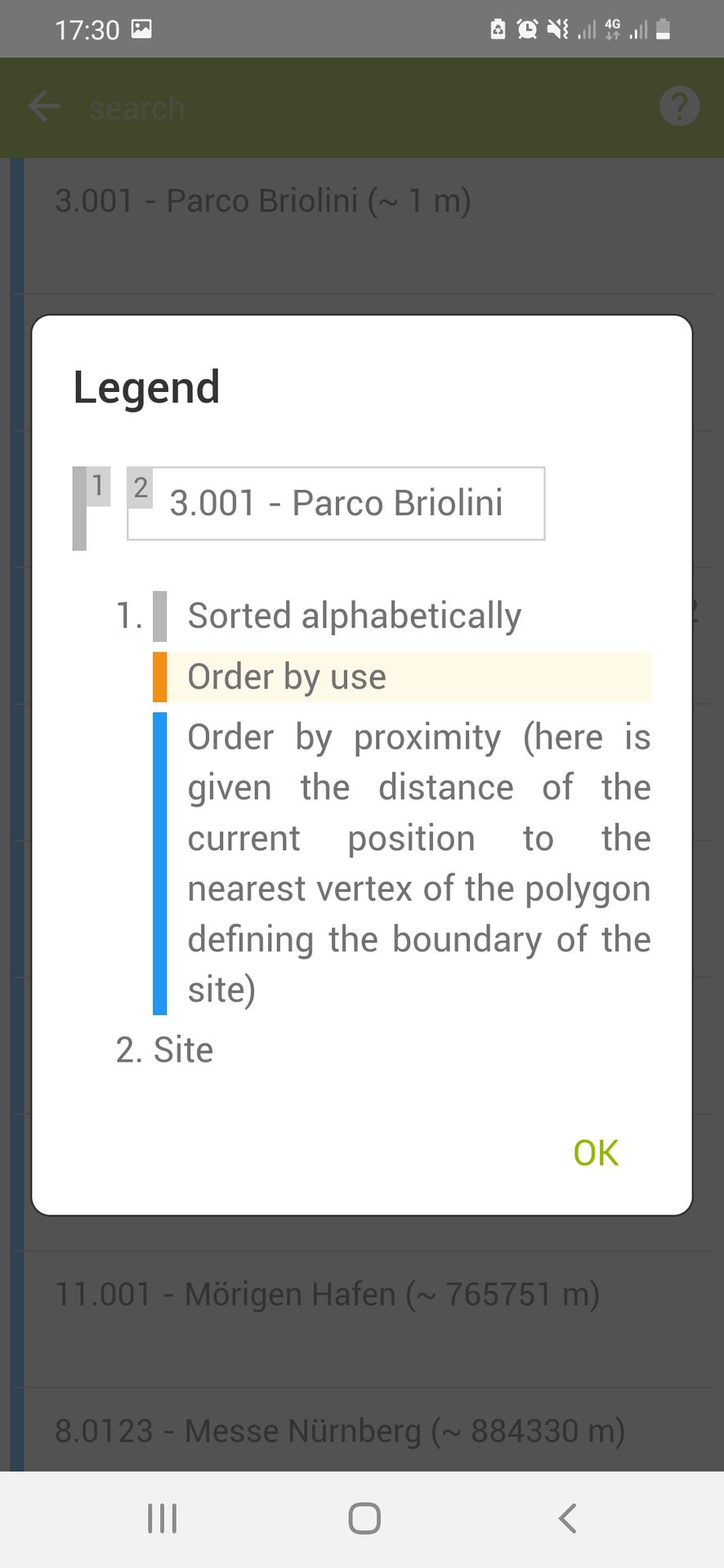 Orer by proximity: if the current location of the device is detected for the insertion of the new object, the site is automatically assigned according to the detected location. It is however possible to change the site manually via the list. The 10 nearest sites are placed at the top of the list in order of distance from the current position. For these 10 sites, the distance of the current position from the nearest vertex of the polygon, which defines the boundary of the site, is indicated. The other sites follow in alphabetical order.