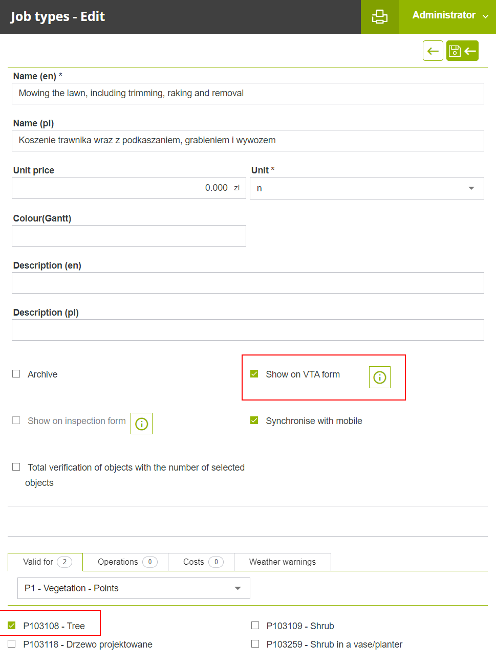 Concretely, if a job type is to be visible in the "VTA" form so that it can be proposed when filling in the checklist, either from the Web or from the Mobile, this job type must first be matched to the object type "P103108- Tree" and must also be flagged as "Show on VTA form".