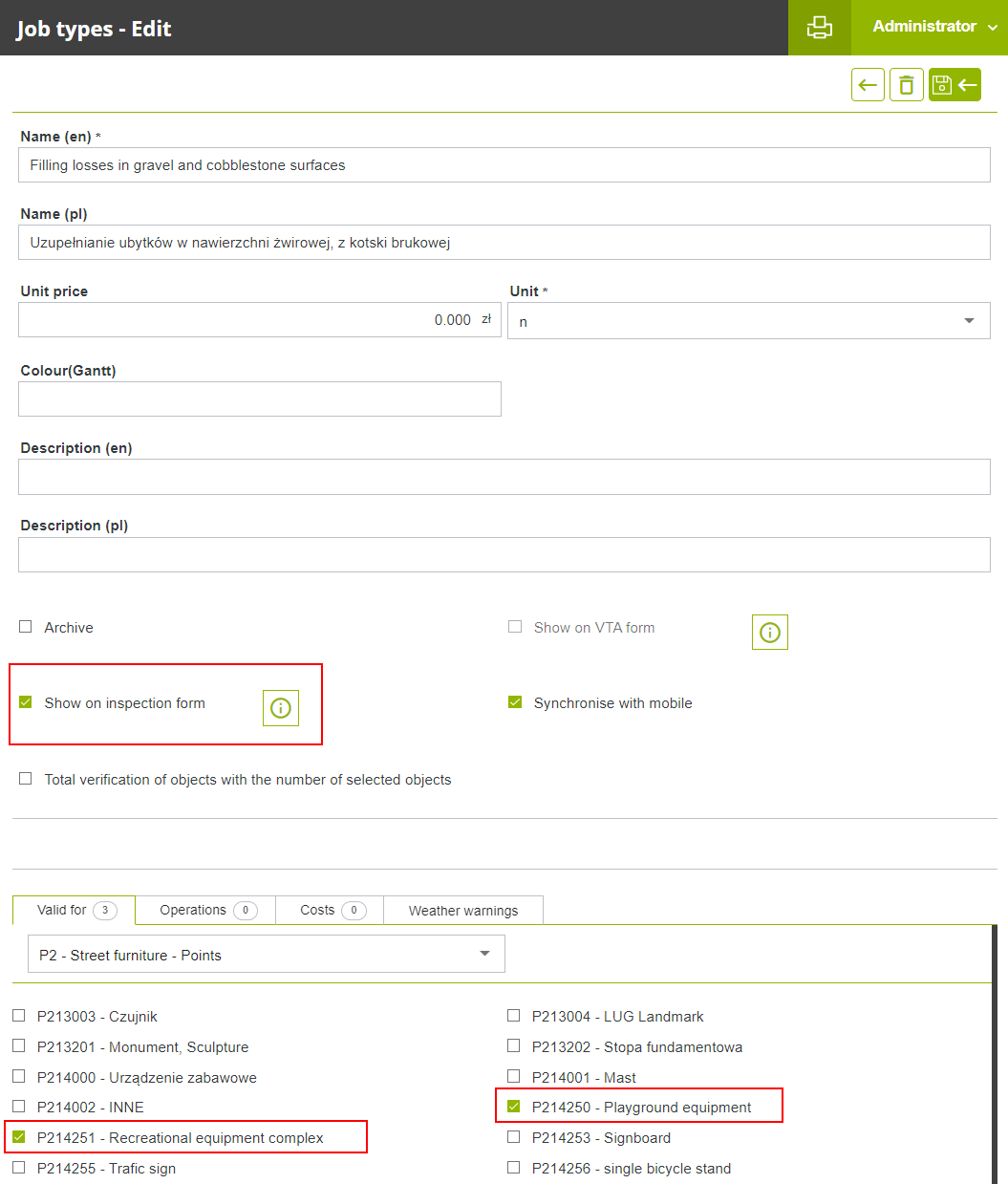Similarly, if a job type is to be visible in the "Inspection" form so that it can be proposed when the inspection is done, this job type must first be combined with the object type "P214250 - Simple playground equipment", "P214251 - Complex playground equipment" and/or "P214288 - Sports equipment" and in addition must be flagged as "Show on inspection form".