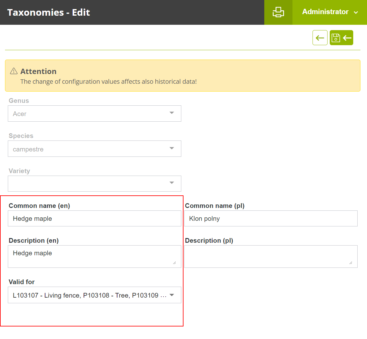 For some customers, the GreenSpaces platform contains a standardised list of taxonomies. This list consists only of verified and existing scientific names and is used for the calculation of ecosystem services in the BENEFITS Module and for the calculation of water requirements in the WATER Module. Until now, the modification of these taxonomies was completely inhibited.